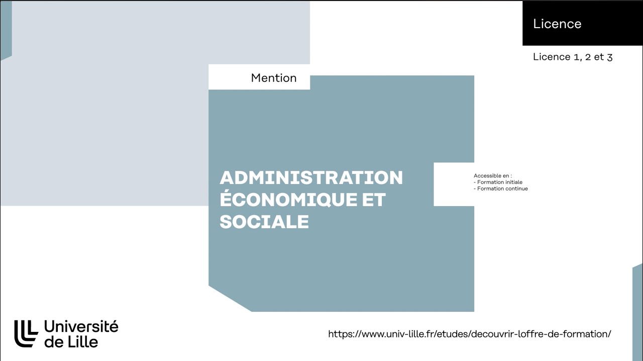 Administration Economique et Sociale [Licence] Domaine : Sciences humaines et sociales. Type de diplôme : Licence LMD. Administration Economique et Sociale [Licence] 2 parcours disponible (s) Télécharger la fiche. Niveau d'étude visé. BAC +3. ECTS. 180 crédits. Durée. 3 ans. Composante. Sciences sociales et administration. Présentation. Programme.