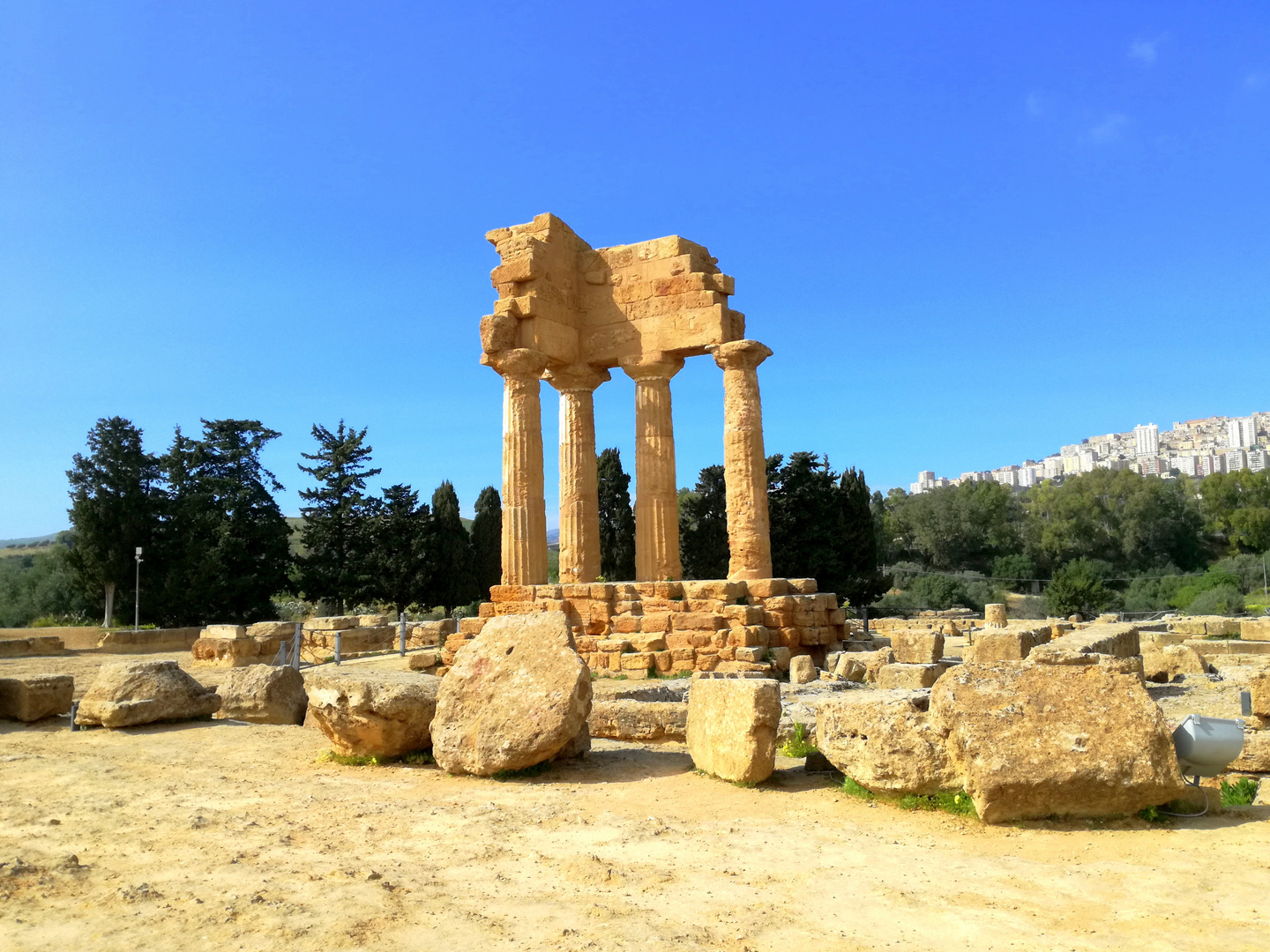 La vallée des Temples est certainement le témoignage le plus important de la culture classique antique en Sicile. Elle comprend les temples des dieux, ainsi que la zone des nécropoles et les sanctuaires extra-moenia. Le temple des Dioscures (Castor et Pollux), les jumeaux légendaires nés de l'union de la reine de Sparte avec Jupiter, ne compte plus aujourd'hui que quatre colonnes et.