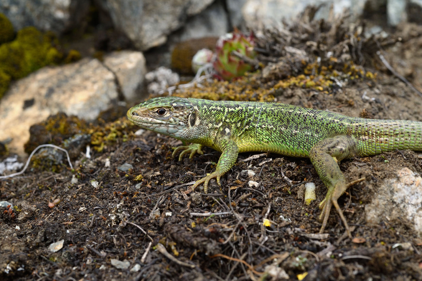 Imaginez un lézard vert mais en deux fois plus grand. Le lézard ocellé est le saurien le plus imposant d'Europe. Sa longueur atteint fréquemment 70 cm et même 90 cm pour certains individus pyrénéens. Sa livrée typiquement ocellée de bleu - plus nettement chez les mâles - en fait également un des plus beaux reptiles de nos régions.