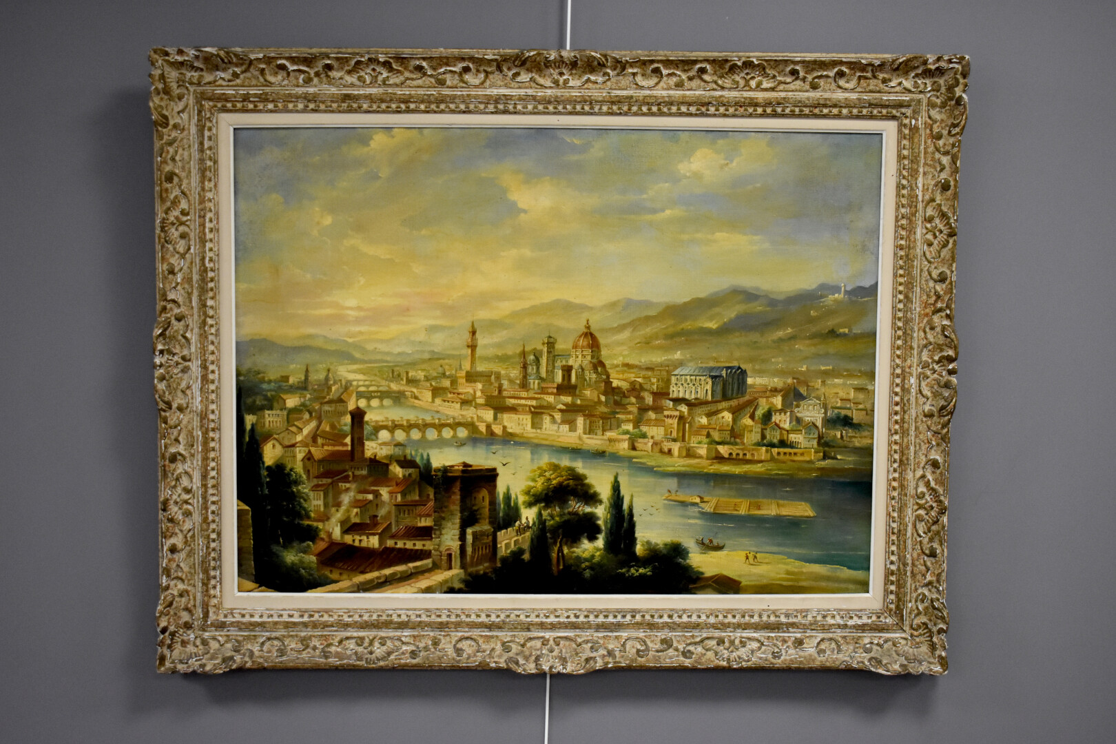 École italienne du XIXe siècle. Vue de Florence. Huile sur toile. 73 x 100 cm. Enchères