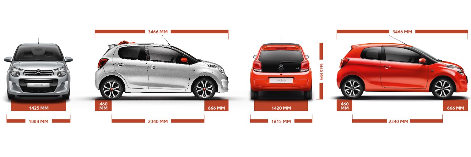 Dimension Citroen C1 2014. Volume coffre : 196 litres. Tableau de bord. Espace intérieur de 4 places. La Citroen C1 a une longueur de 3466 mm, une hauteur de 1460 mm, une largeur de 1615 mm sans les rétroviseurs extérieurs et une mesure de 1884 millimètres avec les rétroviseurs déployés. Motorisation : essence.