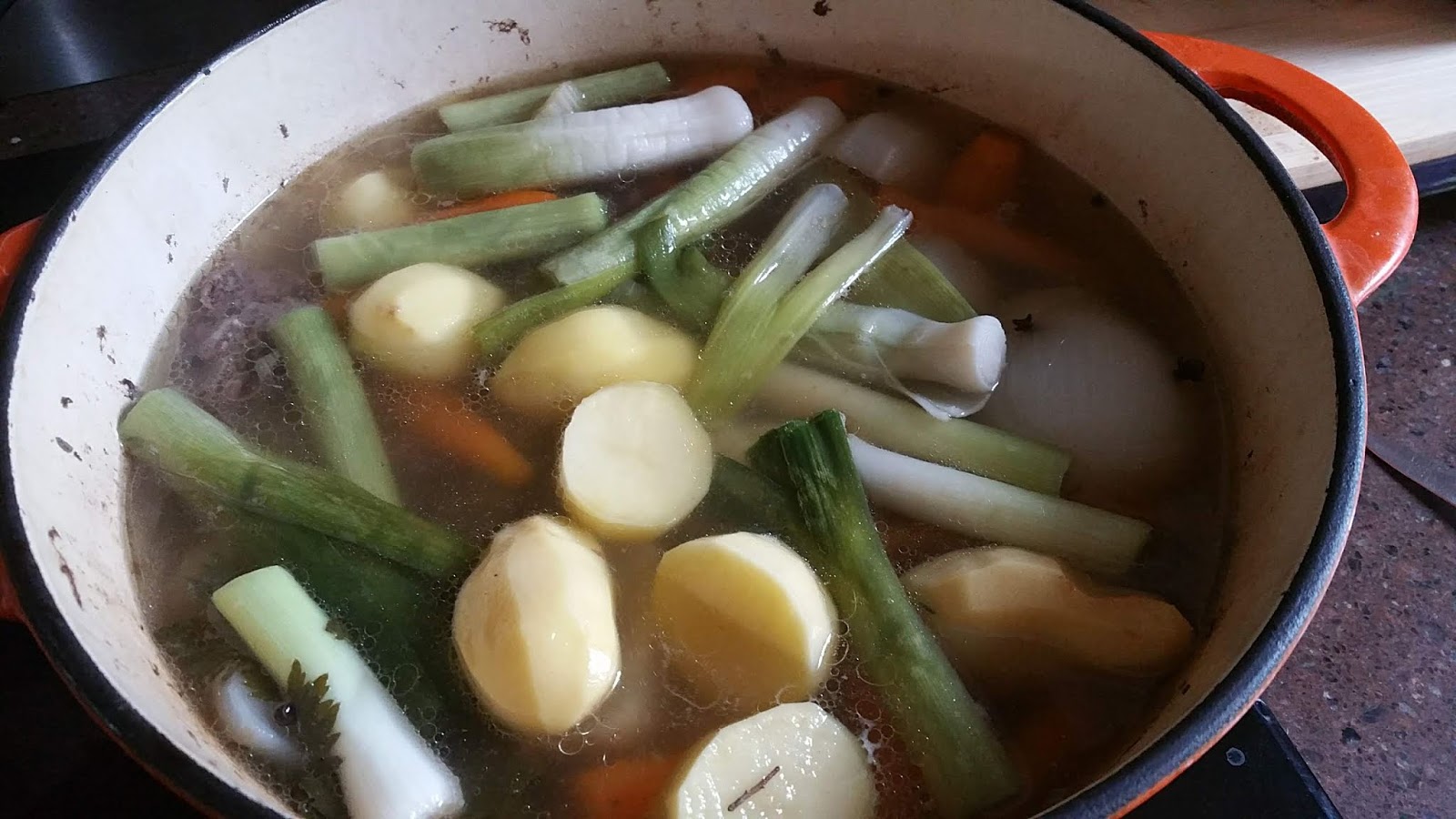 Ajouter le bouillon ou l'eau (recouvrir la viande au complet), porter à ébullition et laisser mijoter à feu bas pendant 2h30. Étape 6. Ajouter les carottes entières et les pommes de terre grelots, puis mijoter encore 30 minutes. Note(s) de l'auteur : Garder le bouillon de surplus et un jarret pour faire une soupe à l'oignon et au sanglier.