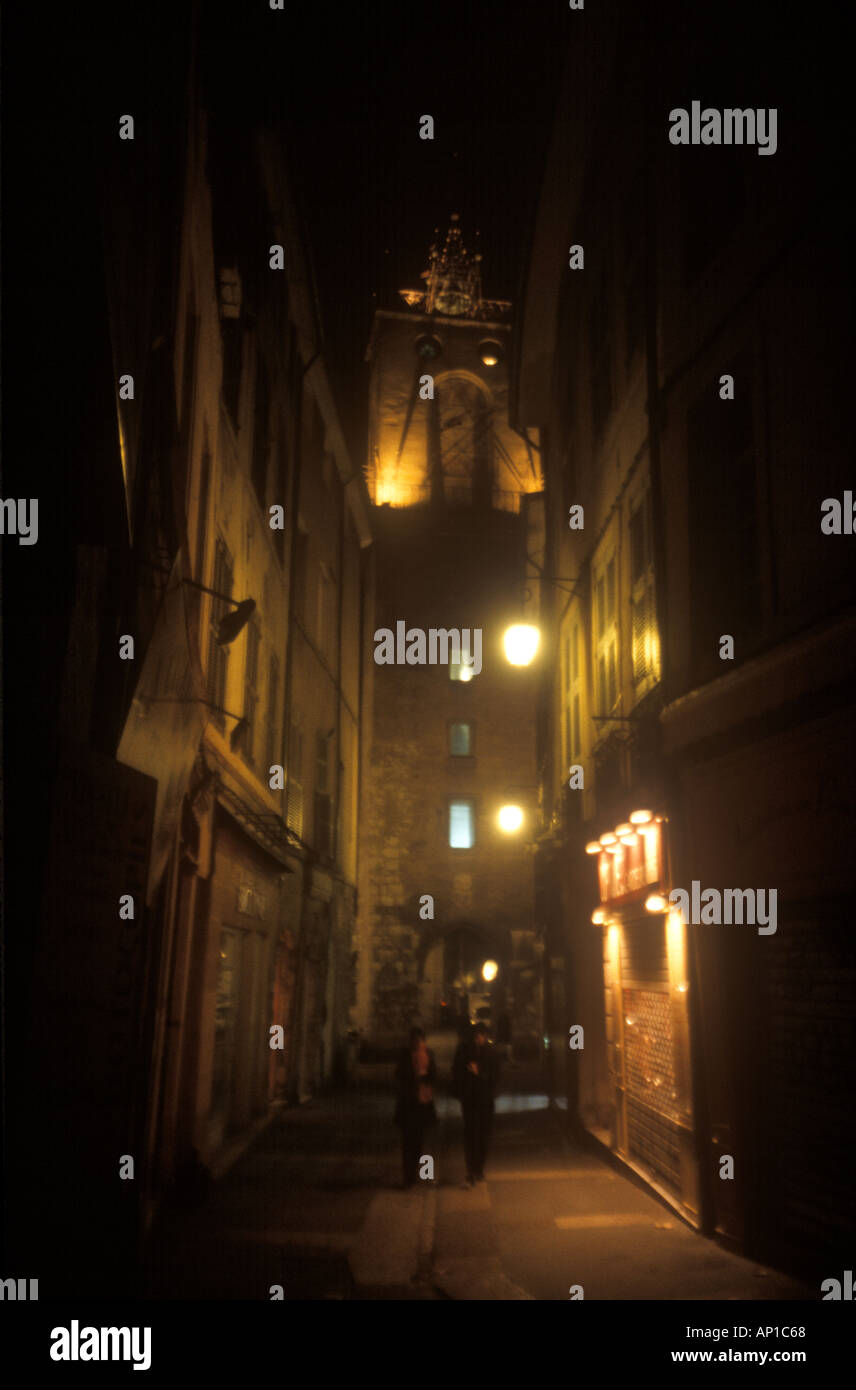 Night view down rue gaston de saporta to the tour de l horloge clock tower old town Aix en