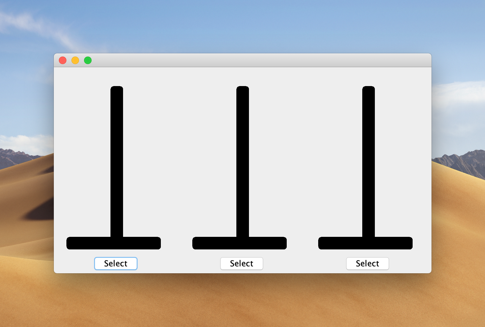 Les tours de Hanoï. Le but de ce jeu est de déplacer les pièces de l'axe vertical gauche vers l'axe vertical droit. Les pièces peuvent être déplacées d'un axe à un autre si l'axe de destination ne contient aucune pièce plus petite que celle que vous souhaitez déplacée. Bonne chance!