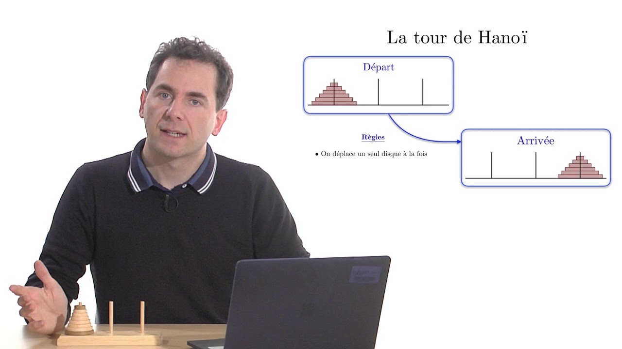 Modèle d'une tour de Hanoï (avec huit disques). Étapes de la résolution du problème à quatre disques. Les tours de Hanoï (originellement, la tour d'Hanoï [a]) sont un jeu de réflexion imaginé par le mathématicien français Édouard Lucas, et consistant à déplacer des disques de diamètres différents d'une tour de « départ » à une tour d'« arrivée » en passant par une tour.